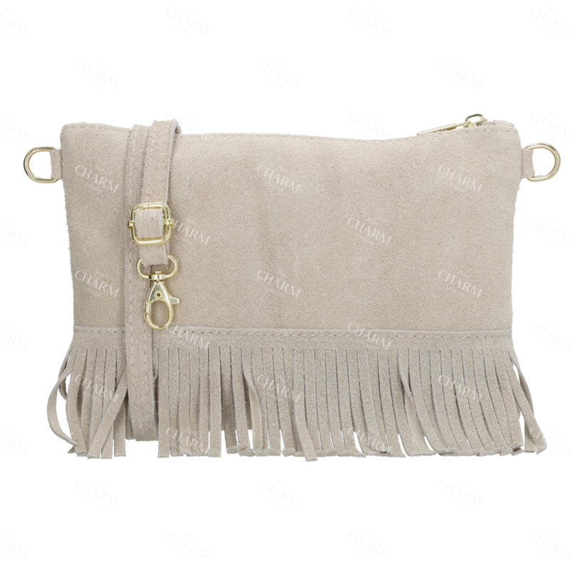 De Charm London Elisa Schoudertas is een elegante suède schoudertas met fijne franjes en subtiele gouden details. Dankzij het compacte formaat en de stijlvolle afwerking is deze tas perfect voor zowel dagelijks gebruik als een avondje uit. De tas sluit bovenaan met een rits en biedt ruimte voor je belangrijkste spullen. De verstelbare en afneembare schouderband zorgt ervoor dat je de tas comfortabel over de schouder of crossbody kunt dragen. De kleine franjes en goudkleurige hardware geven de tas een vrouwelijke, verfijnde uitstraling met een speels accent.