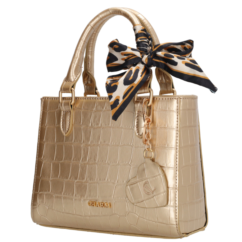 De Charm London Knightsbridge Handtas is een elegante en vrouwelijke tas met een glanzende laklook in croco-reliëf. Dankzij de twee stevige handvatten draag je deze tas comfortabel in de hand of over de arm. Het stijlvolle design maakt de tas perfect voor zowel dagelijks gebruik als speciale gelegenheden. De tas sluit met een ritssluiting en heeft aan de binnenkant een ritsvak en een telefoonvak voor een overzichtelijke indeling. Je kunt de tas ook als schoudertas dragen dankzij de verstelbare en afneembare schouderband. De kleurige details zorgen voor een luxe uitstraling. Als extra detail is de tas afgewerkt met een hartvormige hanger met spiegeltje en een decoratief sjaaltje dat je op verschillende manieren kunt dragen.