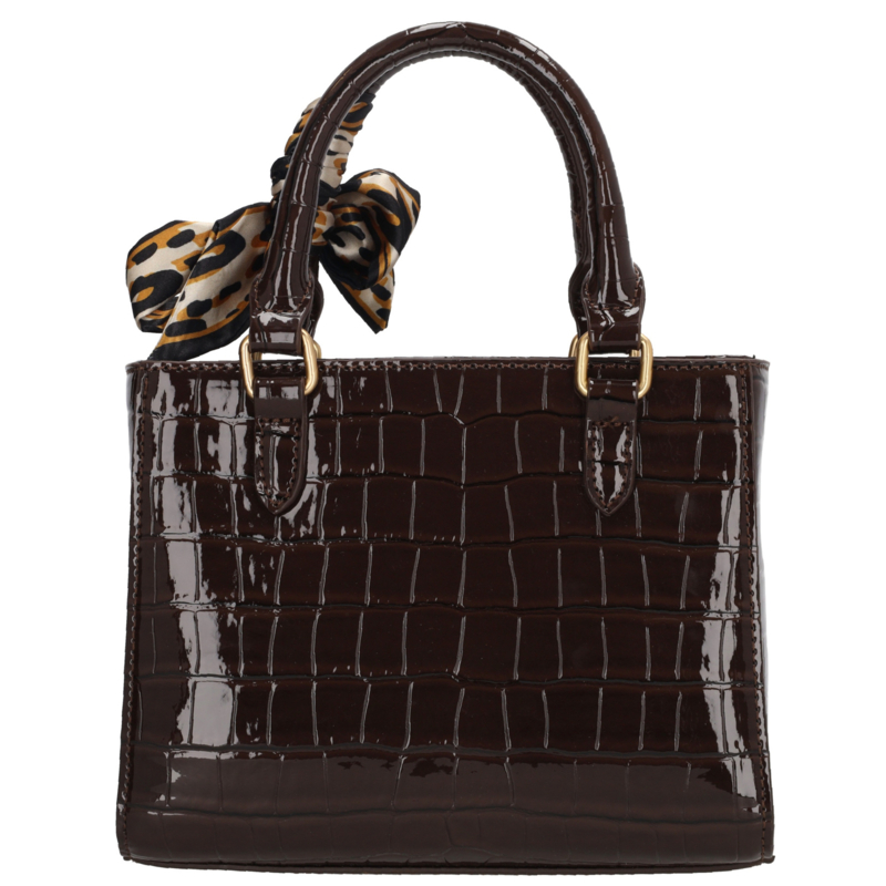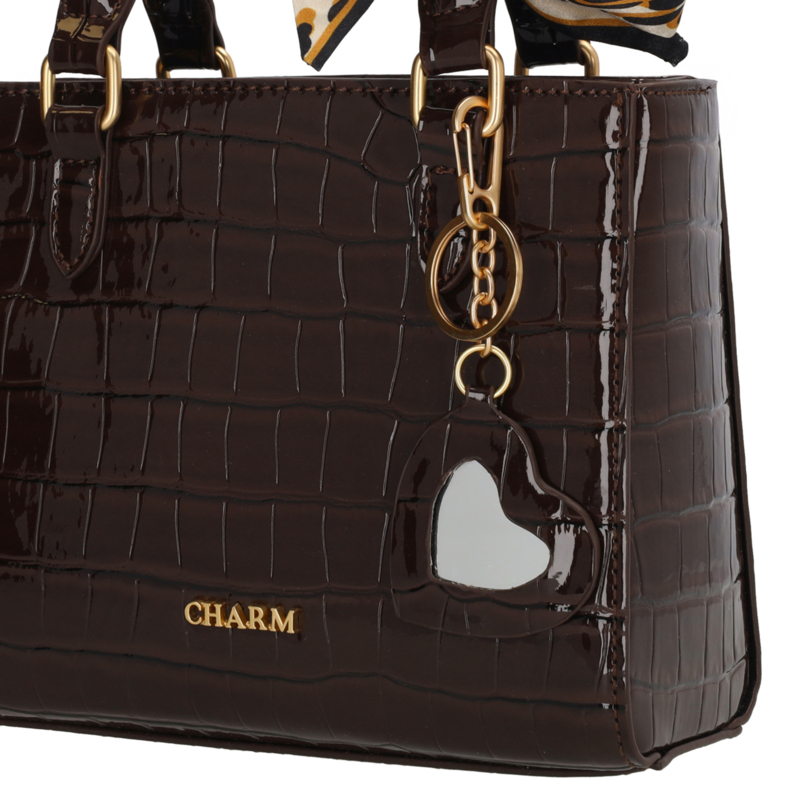 De Charm London Knightsbridge Handtas is een elegante en vrouwelijke tas met een glanzende laklook in croco-reliëf. Dankzij de twee stevige handvatten draag je deze tas comfortabel in de hand of over de arm. Het stijlvolle design maakt de tas perfect voor zowel dagelijks gebruik als speciale gelegenheden. De tas sluit met een ritssluiting en heeft aan de binnenkant een ritsvak en een telefoonvak voor een overzichtelijke indeling. Je kunt de tas ook als schoudertas dragen dankzij de verstelbare en afneembare schouderband. De kleurige details zorgen voor een luxe uitstraling. Als extra detail is de tas afgewerkt met een hartvormige hanger met spiegeltje en een decoratief sjaaltje dat je op verschillende manieren kunt dragen.