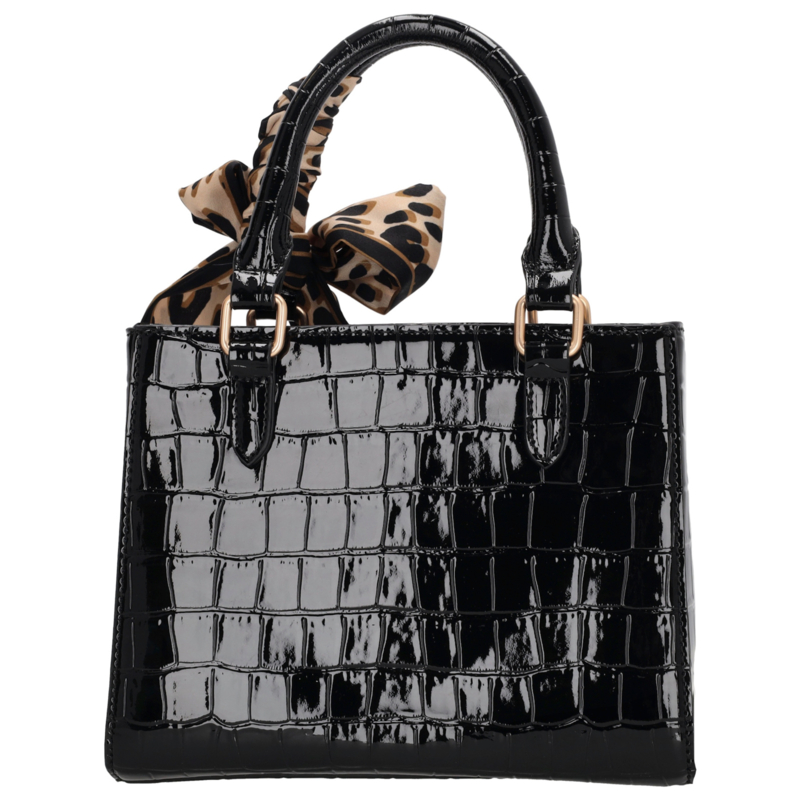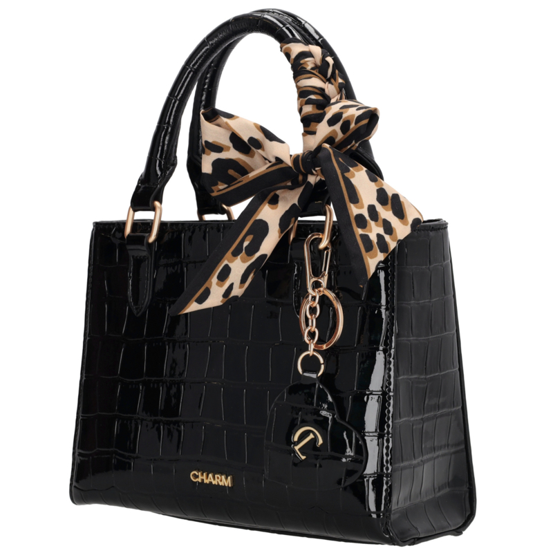 De Charm London Knightsbridge Handtas is een elegante en vrouwelijke tas met een glanzende laklook in croco-reliëf. Dankzij de twee stevige handvatten draag je deze tas comfortabel in de hand of over de arm. Het stijlvolle design maakt de tas perfect voor zowel dagelijks gebruik als speciale gelegenheden. De tas sluit met een ritssluiting en heeft aan de binnenkant een ritsvak en een telefoonvak voor een overzichtelijke indeling. Je kunt de tas ook als schoudertas dragen dankzij de verstelbare en afneembare schouderband. De kleurige details zorgen voor een luxe uitstraling. Als extra detail is de tas afgewerkt met een hartvormige hanger met spiegeltje en een decoratief sjaaltje dat je op verschillende manieren kunt dragen.