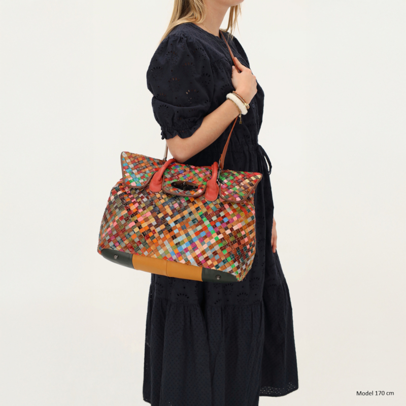 De Multi leren shopper is een kleurrijke en unieke tas die perfect is voor dagelijks gebruik. De shopper is gemaakt van restleer waardoor elke tas anders is en je kiest voor een gerecycled en bewust vervaardigd item. De tas heeft een overslag aan de voorkant die sluit met een slot zodat je spullen veilig opgeborgen zijn. Binnenin vind je twee insteekvakken en een ritsvak waarmee je je essentials overzichtelijk kunt meenemen. De shopper heeft twee stevige handvaten en wordt geleverd met een verstelbare en afneembare schouderband zodat je haar op verschillende manieren kunt dragen.